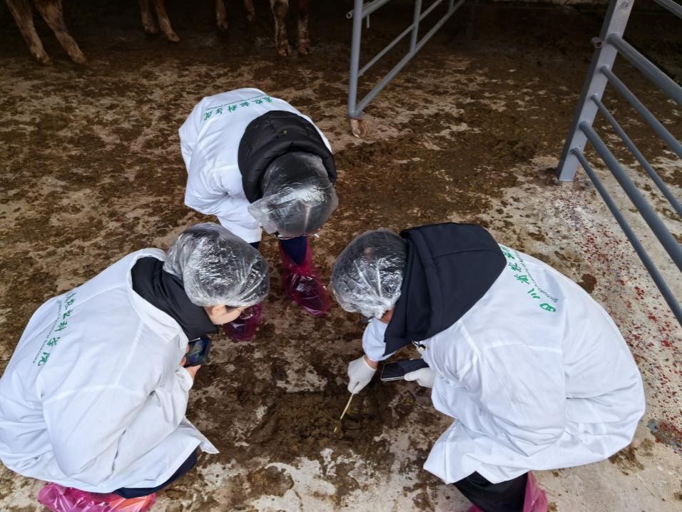实践中,团队发现部分新调入牛只粪便含大量黏液与未消化粗纤维,结合青贮饲料投喂比例偏高的实际,精准判定为消化应激反应。据此,团队现场提出增加优质干草比例、适量添加健胃剂的优化方案,帮助养殖场快速调整饲喂结构、改善牛群肠道健康。同时,队员们向一线养殖人员手把手传授简易粪便观察技巧,普及基础健康判别知识,提升养殖场日常管护能力。