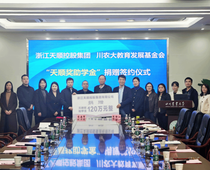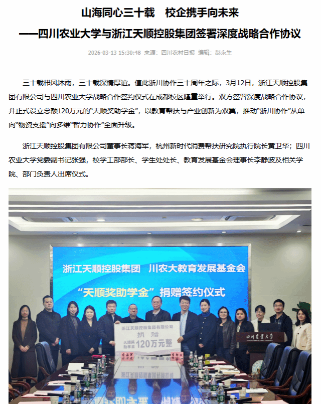 三十载栉风沐雨,三十载深情厚谊。值此浙川协作三十周年之际,3月12日,浙江天顺控股集团有限公司与四川农业大学战略合作签约仪式在成都校区隆重举行。双方签署深度战略合作协议,并正式设立总额120万元的“天顺奖助学金”,以教育帮扶与产业创新为双翼,推动“浙川协作”从单向“物资支援”向多维“智力协作”全面升级。